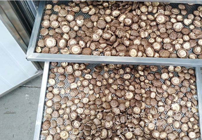 將預(yù)曬后的香菇裝入烘干托盤上,整平后,把托盤一層層放入物料車上,物料車整體高度控制在1.7米左右,分10-13層左右。這樣烘干過程中熱氣流通暢,受熱均勻,烘干烘干排濕效果好。
